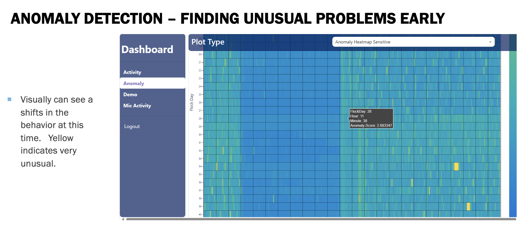 Rather than relying on fixed thresholds alone, the system adapts to context—accounting for flock age, housing conditions, and baseline variability. When significant changes occur, insights are surfaced as clear, actionable alerts that fit into existing workflows.